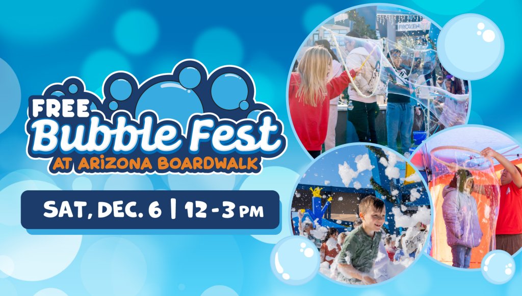 • Fun Stations: Multiple freestanding, tented “Fun Stations” around the Arizona Boardwalk, each with a bubble-themed demonstration, take-home craft, activity, art project, photo opportunity, and lesson about science/shapes/chemistry.