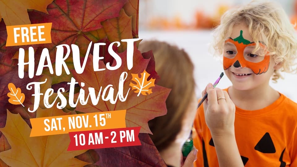 Celebrate the changing of seasons with FREE activities including pumpkin decorating, bounce houses and slides, face painting, coloring contests, live entertainment, games, prizes, and giveaways.