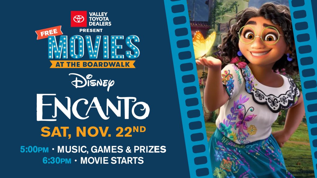 Come experience “Movies at the Boardwalk,” sponsored by Valley Toyota Dealers, a free family event with music, games, and tons of prizes beginning at 5:00 pm. The movie will begin at dusk. There are plenty of options to grab a bite before the movie in the courtyard.